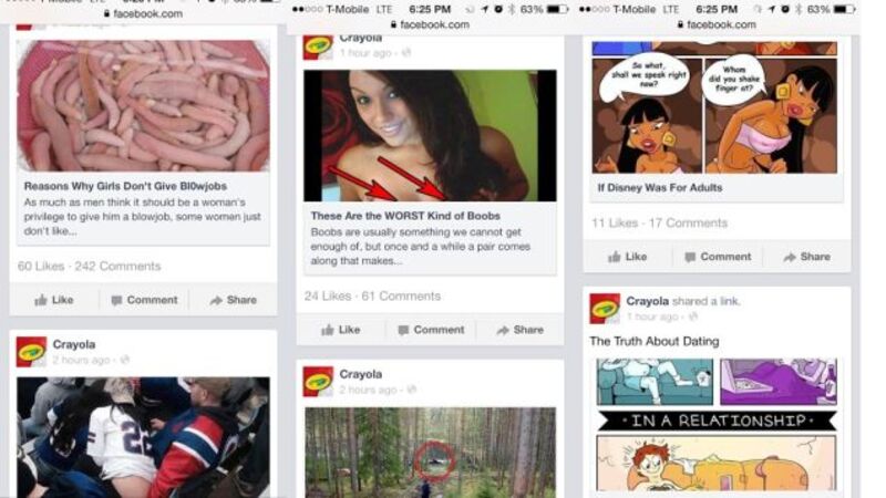 There was a programming shift over the weekend at Crayola's official Facebook page: instead of tutorials for kidz and Christmas greetings, crayon fans were delivered beautifully pure Facebook click-chum posts like "These Are The WORST Kind of Boobs" and "Reason Why Girls Don't Give Bl0wjobs."