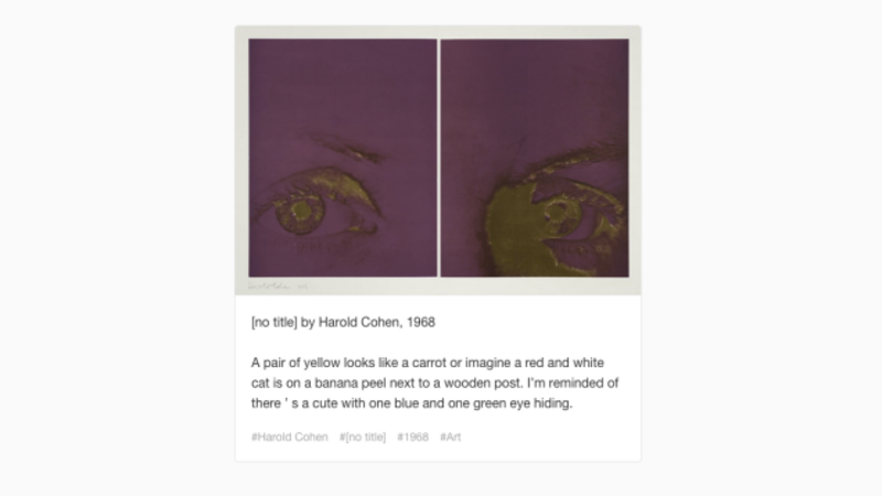 Novice Art Blogger, Plummer-Fernandez's Tumblr, chronicles the travails of a "deep learning" algorithm developed by University of Toronto computer scientists as it attempts to make sense of images pulled from Tate's online archives. The results, "[reformatted] into blogposts" by the artist, are funny, poetic, and often completely nonsensical.