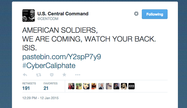 Update: CENTCOM's Twitter account has been suspended, but you can view a cached version of the defaced site here: