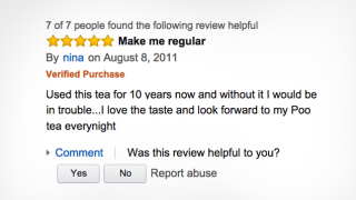 Maybe it’s the fact that older generations are more likely to be drawn to laxative teas in the first place. Maybe it’s the fact that Amazon’s reviews are just generally a rotting wasteland of misspellings and capital letters. Either way, the laxative teas seem to bring out the best (relatively speaking) in every one of the site’s many, esteemed reviewers.